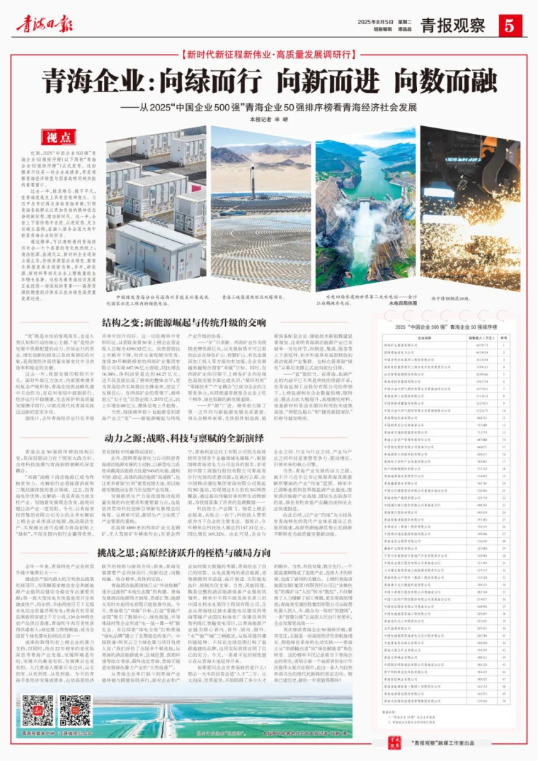 近期,2025“中国企业500强”青海企业50强排序榜(以下简称“青海企业50强排序榜”)正式发布。这份榜单不仅是一份企业成绩单,更是观察青海经济转型与国家战略同频共振的重要窗口。
