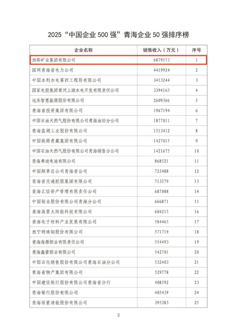 7月21日,青海省工业和信息化厅、青海省政府国有资产监督管理委员会、青海省企业联合会、青海省企业家协会联合发布2025“中国企业500强”青海企业50强排序榜,西部矿业集团有限公司以销售收入687.96亿元连续20年蝉联榜首。