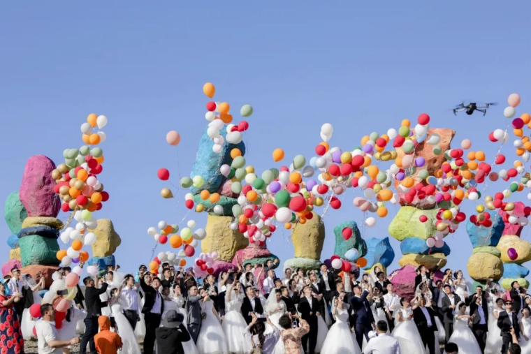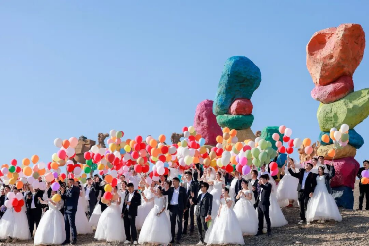 当天的婚礼现场,美拍环节成了“欢乐竞技场”。在伊吾胡杨九千年区、一千年区和玛瑙山,一对对新人办理婚姻登记、放飞爱的气球,用美美的照片留下爱的瞬间、定格永不褪色的爱情。“限时抱妻耐力赛”里,新郎们扎稳马步抱起新娘,脸上的汗珠直往下掉,却没人先放下,围观的同事们喊着“坚持住”,这声“坚持”,和工作中喊的一模一样。爱的彩色气球同时升空,掠过玛瑙山的五彩石,也掠过远处的胡杨林。