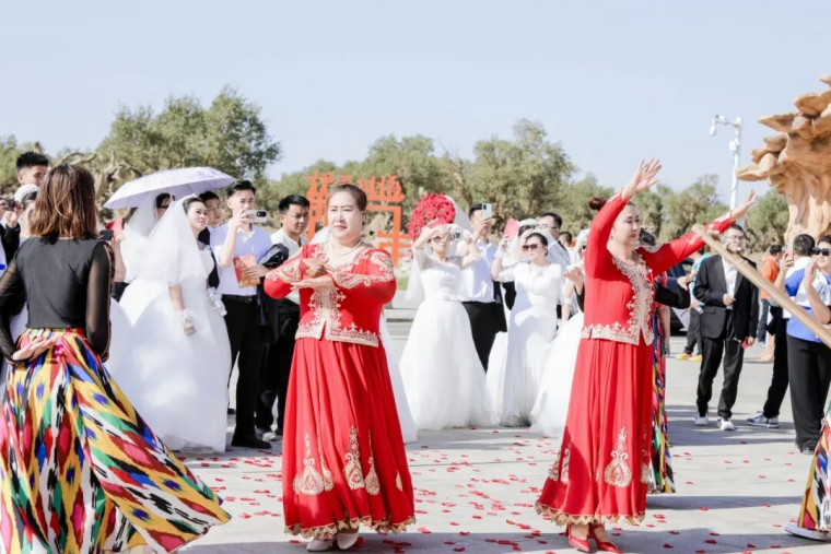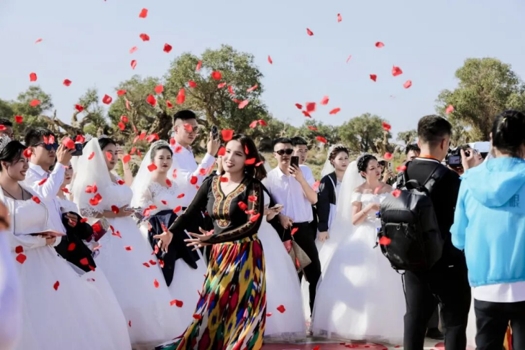 悠扬的弹布尔声里,维吾尔族乐手们载歌载舞,尽情表达内心的喜悦和欢乐,新人们手挽手轻拂戈壁胡杨的风,畅想未来驰骋的梦,每一步都踩着祝福的鼓点,身边的胡杨热烈奔放,为一对对新人送上永恒的祝福。
