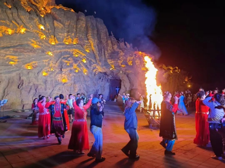 夜色笼罩大地,星星月亮挂在胡杨枝头。主题婚宴、篝火派对、浪漫星空露营便闪亮登场。甜津津的哈密瓜甜品像极了西矿集团全体干部职工越过越好的甜蜜日子;火焰点燃戈壁的夜,星空下、胡杨边,幸福的笑声飘得很远。跳累了,一对对新人就依偎在胡杨边,望着满天星辰,见证“西矿式浪漫”。